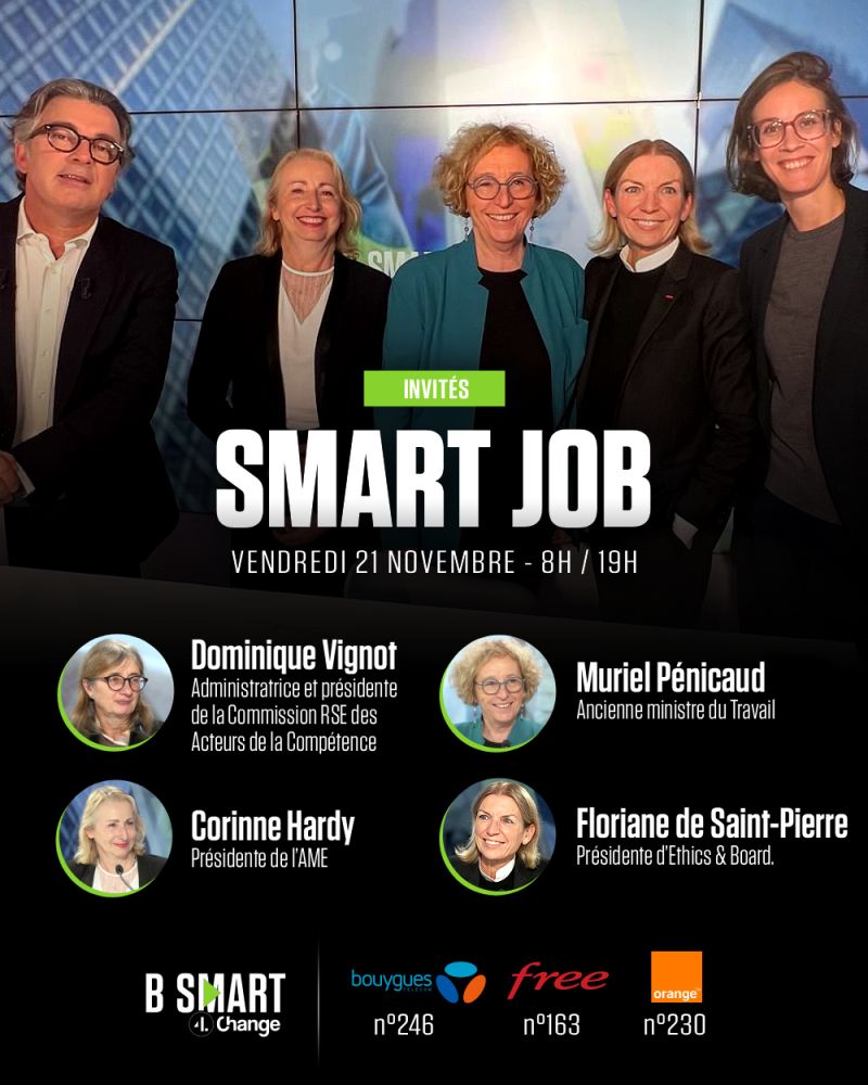 Muriel Pénicaud, ancienne ministre du Travail, Corinne Hardy, présidente de l’AME, et Floriane de Saint-Pierre, présidente d’Ethics & Board participent à l'émission Smart Job du 21 novembre 2025 sur B Smart 4 Change.